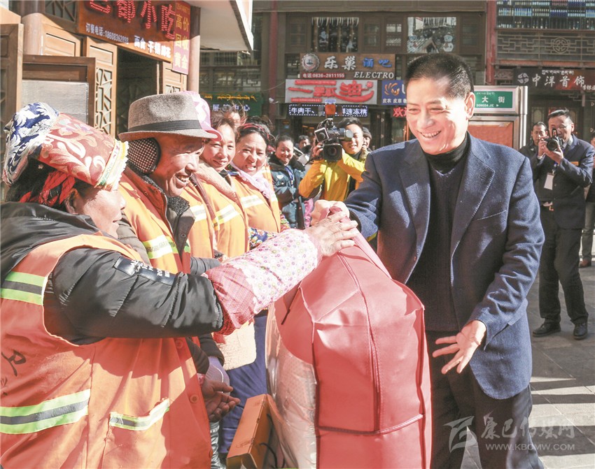 “你們每月工資多少?都按時(shí)領(lǐng)到了嗎?”在將軍橋環(huán)衛(wèi)點(diǎn),劉成鳴與環(huán)衛(wèi)工人親切交談,并一一握手問(wèn)好。劉成鳴代表州四套班子向奮戰(zhàn)在環(huán)衛(wèi)戰(zhàn)線上的全體干部職工致以崇高敬意和新春?jiǎn)柡?,?duì)環(huán)衛(wèi)工人為創(chuàng)造康定潔凈、舒適、優(yōu)美的市容環(huán)境所付出的辛勤勞動(dòng)表示衷心感謝。他說(shuō),環(huán)衛(wèi)工作特別辛苦,又臟又累,環(huán)衛(wèi)工人以“寧愿一人臟、換來(lái)萬(wàn)人潔”的奉獻(xiàn)精神,起早摸黑,頂風(fēng)冒雪,不畏嚴(yán)寒,埋頭苦干,特別在去年我州舉辦一系列重大節(jié)慶活動(dòng)中出色完成了工作任務(wù),在平凡的工作崗位上做出了不平凡的業(yè)績(jī),為推動(dòng)我州經(jīng)濟(jì)社會(huì)發(fā)展作出了積極的貢獻(xiàn)。他希望大家在新的一年里,再接再厲,繼續(xù)發(fā)揚(yáng)無(wú)私奉獻(xiàn)精神,立足本職,愛(ài)崗敬業(yè),努力拼搏,再創(chuàng)佳績(jī),把康定打扮得更加靚麗、更加美好,為城市環(huán)境衛(wèi)生建設(shè)做出新的貢獻(xiàn)。
