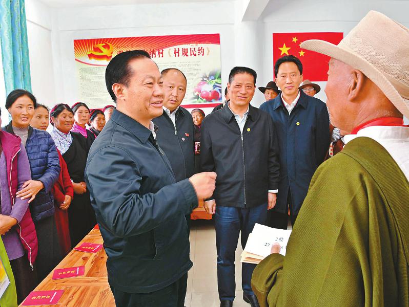 在村民澤翁家中,彭清華細(xì)致察看整修后的旅游民宿,了解房屋結(jié)構(gòu)功能、抗震設(shè)防標(biāo)準(zhǔn)和修建費(fèi)用等,與一家人拉家常、聊增收,鼓勵(lì)他們?cè)俳釉賲?,把日子越過(guò)越好。雅德鄉(xiāng)交納村平均海拔3300米,是典型的高原藏區(qū)貧困村。彭清華沿著崎嶇的山路步行來(lái)到貧困戶(hù)亞瑪忠登和根呷家中,與他們圍坐在一起,共同分析致貧原因和脫貧進(jìn)展,詳細(xì)了解各項(xiàng)幫扶措施落實(shí)情況,為他們脫貧增收鼓勁支招。在交納村村委會(huì)辦公室,彭清華與在這里參加合作社入股分紅活動(dòng)的村民們親切交談。他對(duì)在場(chǎng)的村干部和鄉(xiāng)親們說(shuō),習(xí)近平總書(shū)記、黨中央十分牽掛藏區(qū)群眾,對(duì)扎實(shí)做好藏區(qū)經(jīng)濟(jì)發(fā)展、民生改善和社會(huì)和諧穩(wěn)定特別是脫貧攻堅(jiān)等方面工作作出一系列重要指示、提出明確要求。我們要認(rèn)真學(xué)習(xí)領(lǐng)會(huì)、堅(jiān)決貫徹落實(shí)。希望鄉(xiāng)親們始終銘記習(xí)近平總書(shū)記的深切關(guān)懷,進(jìn)一步堅(jiān)定脫貧信心,大力發(fā)展生產(chǎn),積極學(xué)習(xí)技術(shù),尤其要重視孩子們的培養(yǎng)教育,讓適齡少年兒童都能接受義務(wù)教育,堅(jiān)決阻斷貧困代際傳遞。要充分發(fā)揮群眾的積極性和主動(dòng)性,引導(dǎo)村民依靠自己的辛勤勞動(dòng)拔窮根、摘窮帽,早日脫貧致富奔小康。
