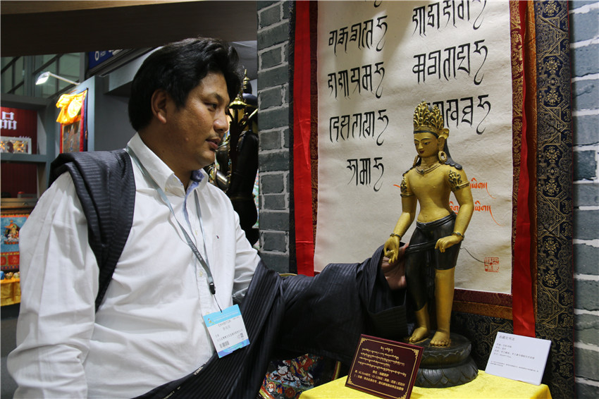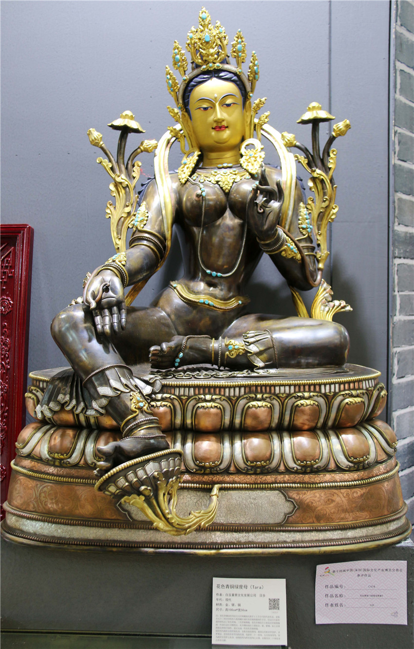 本網(wǎng)訊(記者 宋志勇 文/圖)“這是由什么材料鑄成的物件?”“這件作品的寓意是什么?”“這是一件花色青銅《綠度母佛像》,分別由金、銀、銅鑄成,高100cm、寬50cm,綠度母為觀世音菩薩的化身?!?月12日是第十四屆中國(深圳)國際文化產(chǎn)業(yè)博覽交易會第三天,甘孜展館迎來了眾多參觀者,在館內(nèi)市民正與白玉縣董察文化發(fā)展有限責(zé)任公司董事長日多一問一答。