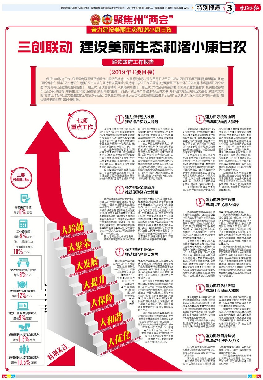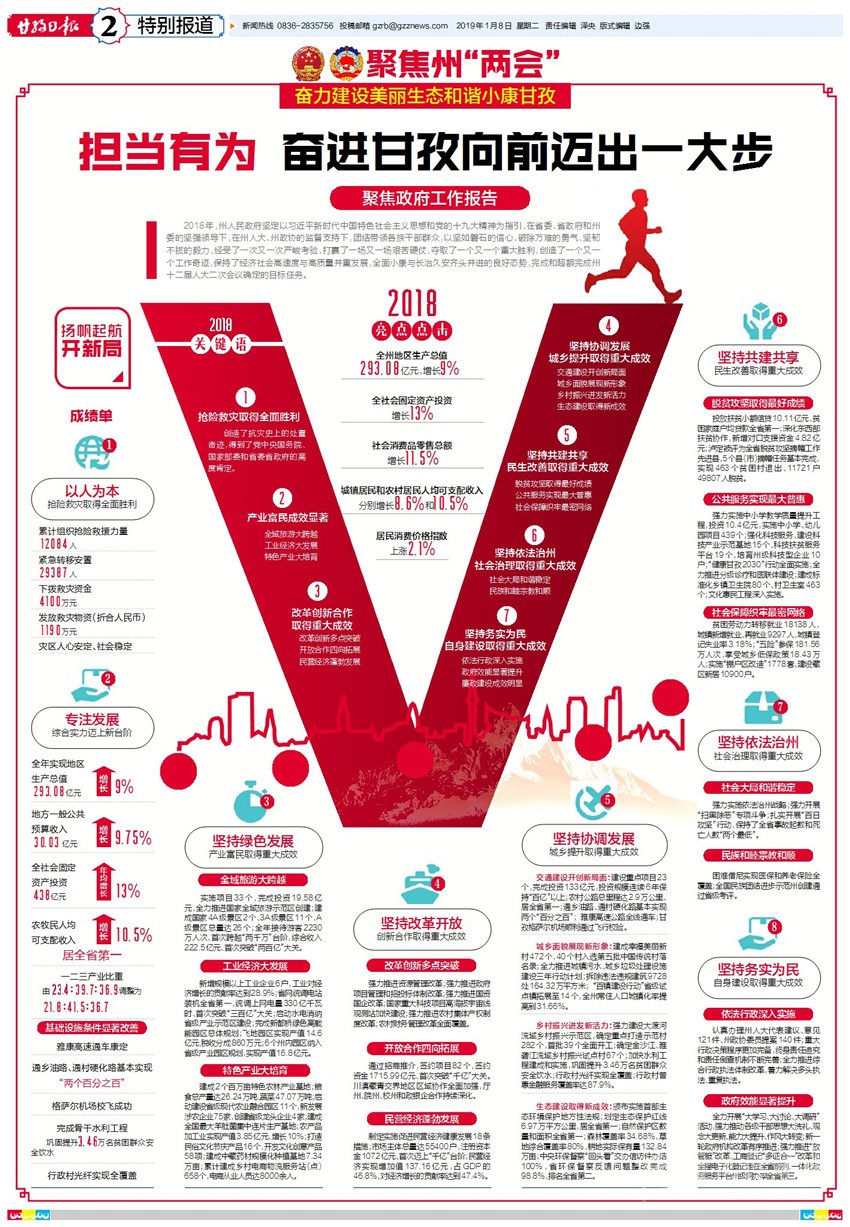 肖友才指出,今年發(fā)展形勢(shì)更加復(fù)雜、發(fā)展任務(wù)更加繁重,我們必須緊緊抓住大有可為的重要戰(zhàn)略機(jī)遇期和政策紅利“窗口期”,統(tǒng)籌兼顧、突出重點(diǎn)、突破難點(diǎn),全力保持經(jīng)濟(jì)社會(huì)高速度與高質(zhì)量并重發(fā)展良好態(tài)勢(shì),重點(diǎn)做好以下工作:一是強(qiáng)力抓好經(jīng)濟(jì)發(fā)展,推動(dòng)綜合實(shí)力大跨越。堅(jiān)持把項(xiàng)目投資作為推動(dòng)高質(zhì)量發(fā)展的重中之重,全力確保完成全社會(huì)固定資產(chǎn)投資460億元以上、地區(qū)生產(chǎn)總值突破“三百億”大關(guān);深化商貿(mào)流通領(lǐng)域改革,強(qiáng)力拓展消費(fèi)市場(chǎng),健全“圣潔甘孜”產(chǎn)品質(zhì)量標(biāo)準(zhǔn)體系,實(shí)現(xiàn)社會(huì)消費(fèi)品零售總額112億元以上;堅(jiān)定不移支持民營(yíng)經(jīng)濟(jì)發(fā)展,力爭(zhēng)民營(yíng)經(jīng)濟(jì)市場(chǎng)主體突破6萬戶、民營(yíng)企業(yè)突破8000戶,民營(yíng)經(jīng)濟(jì)增加值占GDP比重達(dá)到48%以上;堅(jiān)持以供給側(cè)結(jié)構(gòu)性改革為主線,強(qiáng)力推動(dòng)各項(xiàng)改革任務(wù)落地見效。二是強(qiáng)力抓好全域旅游,推動(dòng)旅游經(jīng)濟(jì)大繁榮。堅(jiān)定不移實(shí)施產(chǎn)業(yè)富民戰(zhàn)略,全力推進(jìn)以全域旅游為核心的生態(tài)優(yōu)先、綠色發(fā)展,強(qiáng)力構(gòu)建“三環(huán)一帶兩濕地”發(fā)展格局,全力打造世界重要旅游目的地和國(guó)家全域旅游示范區(qū);堅(jiān)持把建設(shè)國(guó)際生態(tài)文化旅游目的地作為重要工作,全力打響中國(guó)最美雪山、中國(guó)最美濕地、中國(guó)最美草原、中國(guó)最美藏寨、中國(guó)最美漢子“五張名片”,強(qiáng)力培育生態(tài)文化旅游品牌。三是強(qiáng)力抓好工業(yè)強(qiáng)州,推動(dòng)特色產(chǎn)業(yè)大發(fā)展。堅(jiān)定不移實(shí)施工業(yè)強(qiáng)州戰(zhàn)略,堅(jiān)持“優(yōu)先發(fā)展新興產(chǎn)業(yè)、大力發(fā)展農(nóng)特加工產(chǎn)業(yè)、有序發(fā)展電礦產(chǎn)業(yè),大建園區(qū)、建大園區(qū),大建基地、建大基地,大建產(chǎn)業(yè)、建大產(chǎn)業(yè)”思路,強(qiáng)力推進(jìn)產(chǎn)業(yè)向園區(qū)集中;堅(jiān)持以建設(shè)國(guó)家級(jí)清潔能源基地為統(tǒng)攬,積極穩(wěn)妥開發(fā)礦產(chǎn)資源,積極發(fā)展戰(zhàn)略性新興產(chǎn)業(yè),強(qiáng)力推進(jìn)電礦向高端集群;堅(jiān)持以建設(shè)現(xiàn)代高原特色農(nóng)牧業(yè)基地為重點(diǎn),深入推進(jìn)農(nóng)業(yè)供給側(cè)結(jié)構(gòu)性改革,強(qiáng)力推進(jìn)龍頭向基地集聚。四是強(qiáng)力抓好統(tǒng)籌協(xié)調(diào),推動(dòng)城鄉(xiāng)面貌大提升。堅(jiān)定不移實(shí)施城鄉(xiāng)提升戰(zhàn)略,堅(jiān)持“七管齊下”“四態(tài)合一”的思路,做強(qiáng)縣城、做優(yōu)鄉(xiāng)鎮(zhèn)、做美村寨,全面推進(jìn)城鄉(xiāng)建設(shè)提檔升級(jí);堅(jiān)定不移實(shí)施鄉(xiāng)村振興戰(zhàn)略,編制完成全州鄉(xiāng)村振興戰(zhàn)略規(guī)劃和18個(gè)縣(市)鄉(xiāng)村振興規(guī)劃,全面推進(jìn)鄉(xiāng)村振興試點(diǎn)示范;堅(jiān)定不移實(shí)施交通先行戰(zhàn)略,強(qiáng)力打好第四輪“交通大會(huì)戰(zhàn)”,全面推進(jìn)區(qū)域綜合交通樞紐;高標(biāo)準(zhǔn)編制災(zāi)后重建實(shí)施方案和項(xiàng)目清單,強(qiáng)力推進(jìn)金沙江白格堰塞湖災(zāi)后恢復(fù)重建。五是強(qiáng)力抓好脫貧攻堅(jiān),推動(dòng)民生民利大保障。堅(jiān)定不移實(shí)施扶貧攻堅(jiān)戰(zhàn)略,堅(jiān)持把脫貧攻堅(jiān)作為最大的政治責(zé)任、最大的民生工程、最大的發(fā)展機(jī)遇,決戰(zhàn)決勝脫貧攻堅(jiān);深入實(shí)施教學(xué)質(zhì)量提升工程,深化醫(yī)療衛(wèi)生體制改革,完善公共文化服務(wù)體系,全力辦好社會(huì)事業(yè);堅(jiān)持就業(yè)優(yōu)先,大規(guī)模開展職業(yè)技能培訓(xùn),全面實(shí)施全民參保計(jì)劃,依法保障退役軍人合法權(quán)益,持續(xù)推進(jìn)城鎮(zhèn)棚戶區(qū)改造,全力做好水電移民安置工作,筑牢社會(huì)保障體系;堅(jiān)定不移實(shí)施生態(tài)文明建設(shè)戰(zhàn)略,嚴(yán)格落實(shí)“三線一單”制度,強(qiáng)力推進(jìn)國(guó)家生態(tài)文明建設(shè)示范區(qū)創(chuàng)建,提升生態(tài)民生福祉。六是強(qiáng)力抓好依法治理,推動(dòng)社會(huì)局面大和諧。堅(jiān)定不移實(shí)施依法治州戰(zhàn)略,深化“三區(qū)”維穩(wěn)體系和依法常態(tài)化治理,深入開展反分裂斗爭(zhēng),建設(shè)更高質(zhì)量的平安甘孜;堅(jiān)定不移把社會(huì)管理納入法治化軌道,鞏固更加和諧的民族宗教關(guān)系;堅(jiān)定不移落實(shí)安全生產(chǎn)“黨政同責(zé)、一崗雙責(zé)、齊抓共管、失職追責(zé)”責(zé)任制,構(gòu)建更大密度的安全監(jiān)管網(wǎng)絡(luò)。七是強(qiáng)力抓好自身建設(shè),推動(dòng)政務(wù)服務(wù)大優(yōu)化。堅(jiān)持依憲施政、依法治政,自覺運(yùn)用法治思維和法治方式推進(jìn)政府工作,堅(jiān)決讓公平和正義成為常態(tài);完成新一輪政府機(jī)構(gòu)改革,