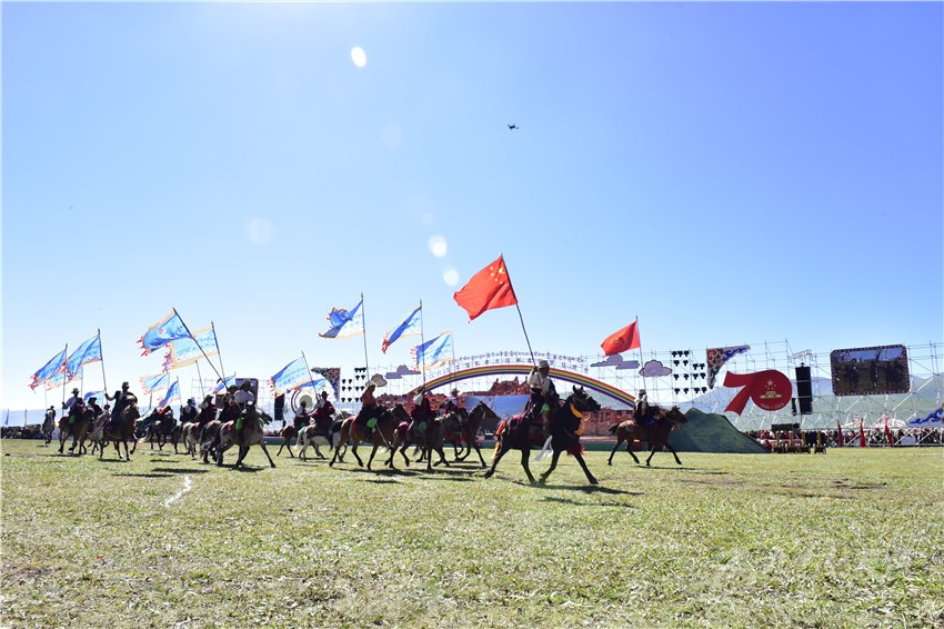 “四山旗似晴霞卷,萬馬蹄如驟雨來”。上午十點,石渠縣四個片區(qū)組成的四個馬隊方陣高舉印有“世界最美濕地”“千年唐蕃古道”“石刻藝術(shù)王國”“吉祥太陽部落”字樣的四色彩旗,眾星拱月般簇?fù)碇腥A人民共和國國旗和慶祝中華人民共和國成立70周年活動標(biāo)識,策馬入場,拉開了2019中國·石渠—太陽部落帳篷狂歡節(jié)的帷幕。