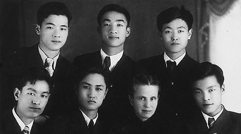 1949 年 6月1日,李鵬同志(后排左)在蘇聯(lián)伊萬諾沃動力學院補習數(shù)理化及俄文時與俄語教師費德洛娃(前排左三)及同學合影。 新華社發(fā)