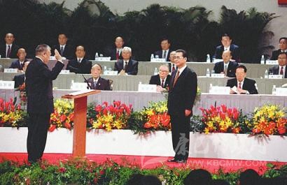 1997年7月1日凌晨,中華人民共和國香港特別行政區(qū)成立暨特區(qū)政府宣誓就職儀式在香港會議展覽中心新翼七樓隆重舉行。香港特區(qū)首任行政長官董建華宣誓就職,李鵬同志監(jiān)誓。 新華社記者 劉建國 攝