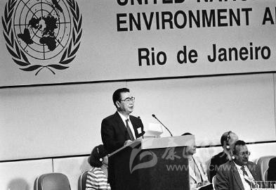 1992 年 6月12日,李鵬同志在聯(lián)合國環(huán)境與發(fā)展大會首腦會議上發(fā)言。 新華社記者 李生南 攝