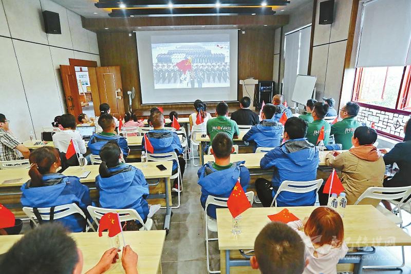 10月1日上午,雅安市蘆山縣龍門(mén)鎮(zhèn)上百名干部群眾聚集到龍門(mén)山莊,共同觀看直播。