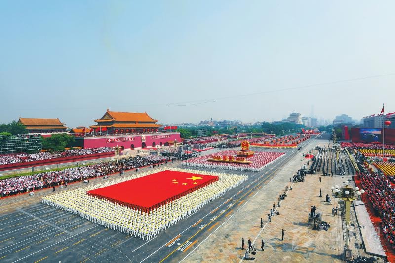 在世界最大的廣場,上演著一場特殊的“快閃”:少年兒童從金水橋走來,稚嫩的童聲響亮。國旗旗桿旁的戰(zhàn)士在唱,身著盛裝的各民族代表在唱,和睦幸福的一家人在唱……全場聯(lián)歡群眾和現(xiàn)場觀眾形成氣勢恢弘的大合唱。