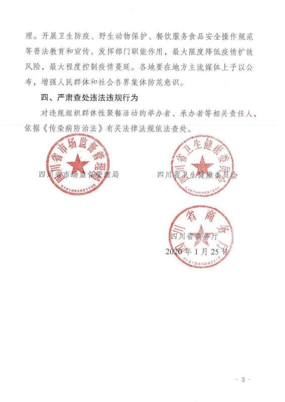 四川新聞網(wǎng)成都1月25日訊(記者 李丹)1月25日,四川省市場監(jiān)督管理局、四川省衛(wèi)生健康委員會、四川省商務(wù)廳3部門聯(lián)合發(fā)布緊急通知,近期新型冠狀病毒感染的肺炎疫情防控形勢嚴(yán)峻,為認(rèn)真貫徹落實(shí)省委省政府關(guān)于啟動重大突發(fā)公共衛(wèi)生事件一級響應(yīng)措施暨應(yīng)對新型冠狀病毒感染的肺炎疫情決策部署,有效保證廣大群眾生命安全,根據(jù)《傳染病防治法》等有關(guān)法律法規(guī),禁止任何餐飲單位和個(gè)人舉辦任何形式的群體性聚餐活動,已經(jīng)訂餐的應(yīng)盡快取消或延期舉辦。