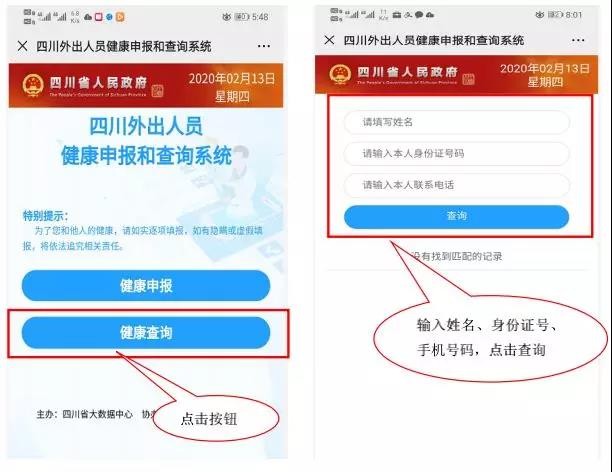 查詢人員經被查詢人同意后,進入“健康查詢”欄目,輸入被查詢人的姓名、身份證號、手機號碼(3 個要素須全部齊全),即可查詢相關信息。也可在微信“支付”和支付寶首頁掃碼查看。
