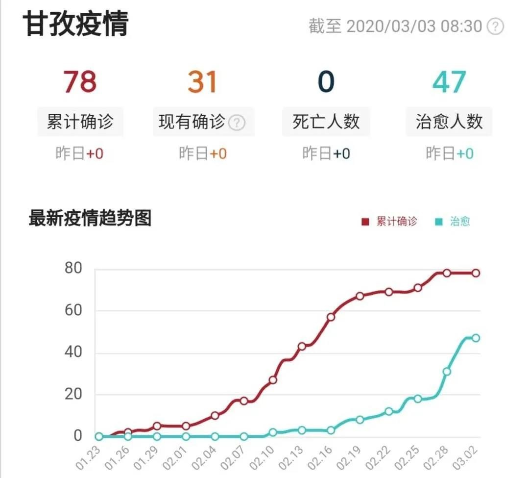 截至3月2日24時,我州累計報告確診病例78例,累計治愈出院47人(道孚縣42人、康定市2人、色達縣2人、稻城縣1人),其余31人均在定點醫(yī)院隔離治療,203名密切接觸者正在接受醫(yī)學觀察。我州道孚縣連續(xù)4天無確診病例報告,其余17個縣(市)連續(xù)28天無確診病例