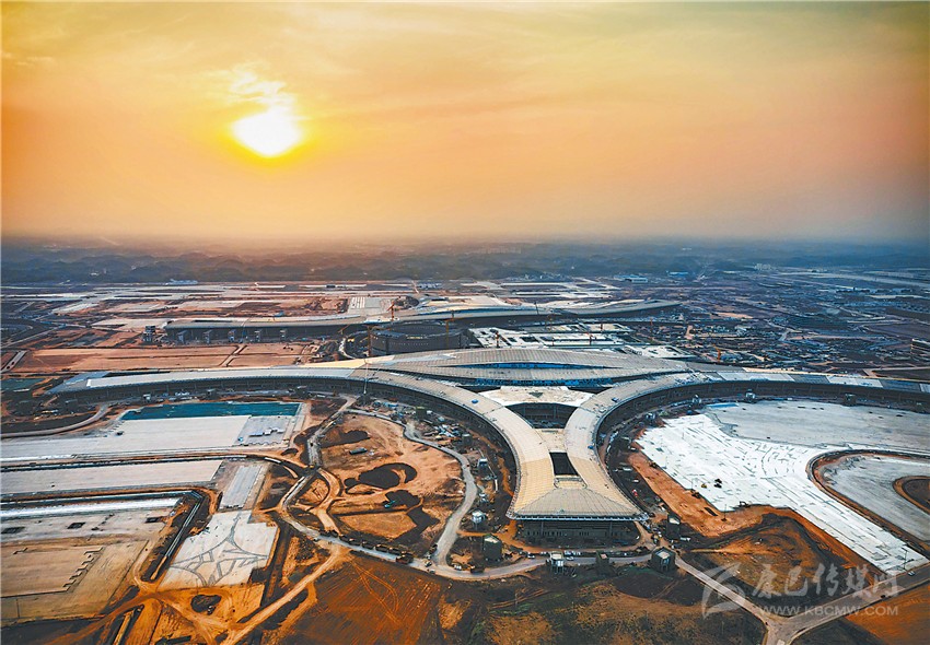 俯瞰晨曦中的成都天府國際機場施工現(xiàn)場。成都天府國際機場各項工程自全面復工以來,在嚴格防疫的基礎上,力搶工期,加快建設。