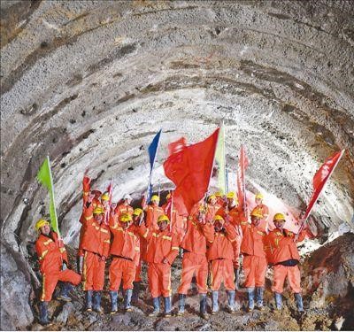 4月7日,施工人員慶祝川藏鐵路拉林段重點(diǎn)控制性工程米林隧道貫通。 新華社記者 覺 果攝