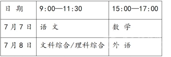 全省一類模式高考于7月7—7月9日統(tǒng)一組織進行。各科目考試時間(北京時間)安排如下: