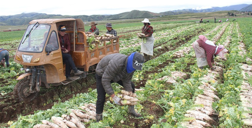 一根根白蘿卜,從理塘縣的沙礫地里,被農(nóng)牧民拔出來,被迅速清洗、包裝,及時(shí)裝上排隊(duì)等候的冷鏈車。過雅江,翻折多山、二郎山,在雪域高原行駛四百公里后,抵達(dá)川西平原,再上成渝環(huán)線高速,后經(jīng)廈蓉高速,抵達(dá)珠海、深圳,進(jìn)入香港、澳門市場。