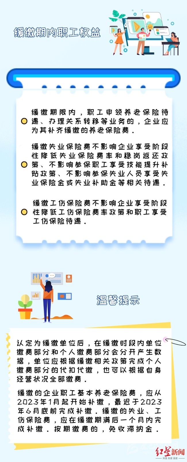 此外,為進一步加強職工權益保障,《通知》還明確,緩繳企業(yè)要依法履行代扣代繳職工個人繳費義務,不得因緩繳社會保險費,影響職工個人權益。企業(yè)原則上應在緩繳期滿后的一個月內(nèi)補繳緩繳的失業(yè)保險、工傷保險費款;緩繳的企業(yè)職工基本養(yǎng)老保險費,應從2023年1月起開始補繳,最遲于2023年6月底前補繳到位,期間免收滯納金。企業(yè)可根據(jù)實際需要,提前申報繳納緩繳的費款,稅務部門應及時征收。緩繳的企業(yè)出現(xiàn)注銷等情形的,應在注銷前繳納緩繳的費款,相關部門按照注銷流程及時辦理。