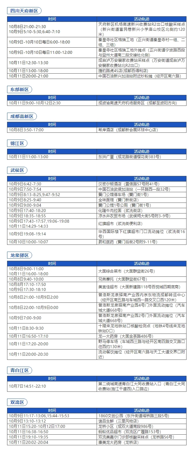 近期新增感染者在蓉軌跡現(xiàn)公布如下,如與以下活動(dòng)軌跡有重疊,立即向社區(qū)和單位(或居住的酒店)報(bào)備,三天內(nèi)接受三次核酸檢測(cè)(間隔24小時(shí)),期間做好個(gè)人防護(hù),不聚會(huì)、不聚餐。如有疑問,請(qǐng)撥打12345咨詢。