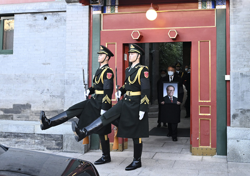 靈車緩緩駛出中南海,在中南海工作的干部職工紛紛來到道路兩旁,胸佩白花、神情凝重,為江澤民同志送別。