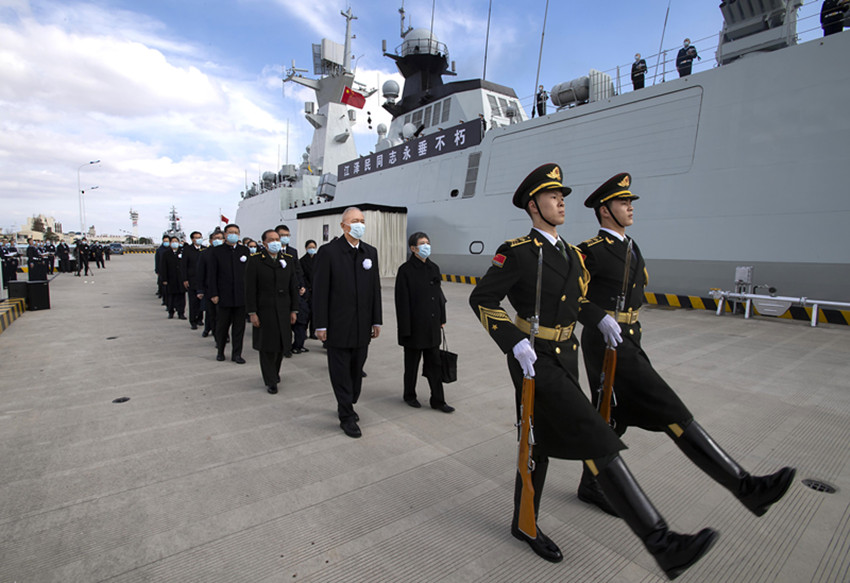 中國人民解放軍海軍揚(yáng)州艦伏波靜臥,艦上官兵分區(qū)列隊(duì)、肅立舷邊。揚(yáng)州是江澤民同志的故鄉(xiāng)。今天,這艘以揚(yáng)州命名的軍艦,以最高禮儀送別這位為黨和人民建立了不朽功勛的卓越領(lǐng)導(dǎo)人。江澤民同志的親屬捧護(hù)著骨灰登上揚(yáng)州艦。海軍笛吹響,儀仗隊(duì)持槍肅立,行注目禮。當(dāng)揚(yáng)州艦起航時(shí),軍港內(nèi)所有艦船汽笛長(zhǎng)鳴,響徹云霄。