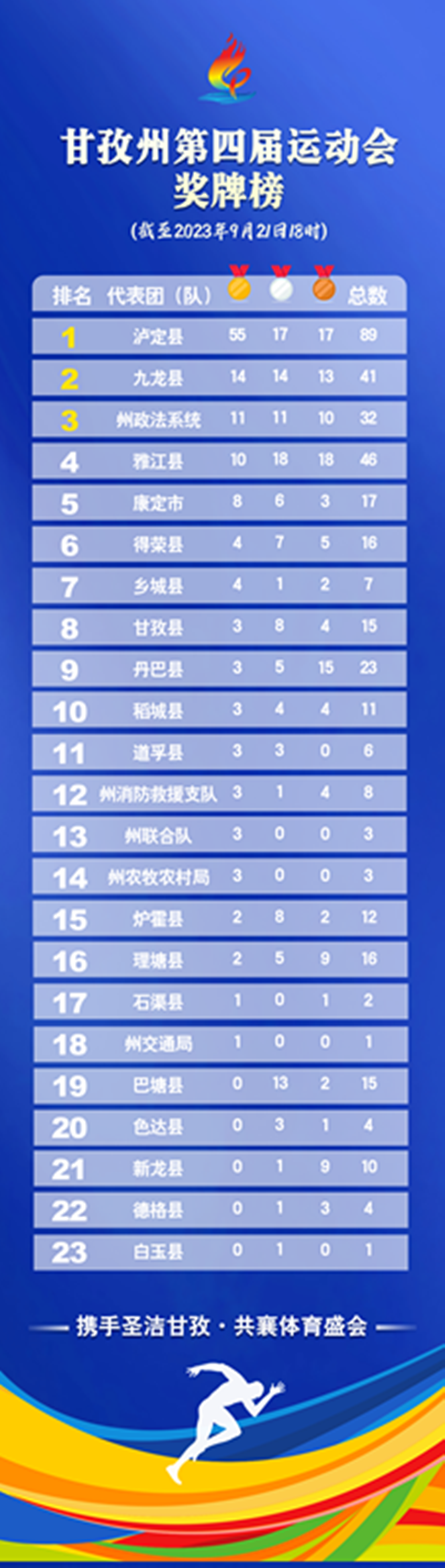 經(jīng)過9天激烈角逐,本屆運(yùn)動(dòng)會(huì)各項(xiàng)比賽任務(wù)圓滿完成,共產(chǎn)生金牌133枚,銀牌127枚,銅牌122枚。瀘定縣代表團(tuán)、雅江縣代表團(tuán)、九龍縣代表團(tuán)分獲獎(jiǎng)牌榜前三名。瀘定縣代表團(tuán)收獲55枚金牌居全州第一,九龍縣代表團(tuán)收獲14枚金牌位居全州第二,州政法系統(tǒng)代表團(tuán)收獲11枚金牌居全州第三。共有96人次打破州運(yùn)會(huì)田徑比賽紀(jì)錄,賽出了風(fēng)格、賽出了水平。
