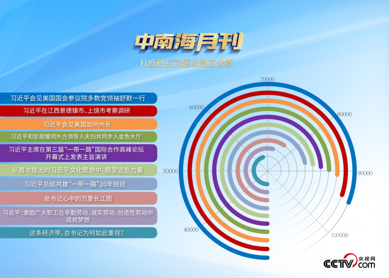 央視網(wǎng)“智聞”系統(tǒng)提取分析10月全網(wǎng)時政新聞熱點(diǎn)顯示,“習(xí)近平主席會見美國國會參議院多數(shù)黨領(lǐng)袖舒默一行”“習(xí)近平會見美國加州州長”“習(xí)近平主持召開進(jìn)一步推動長江經(jīng)濟(jì)帶高質(zhì)量發(fā)展座談會”等話題最受網(wǎng)民關(guān)注。