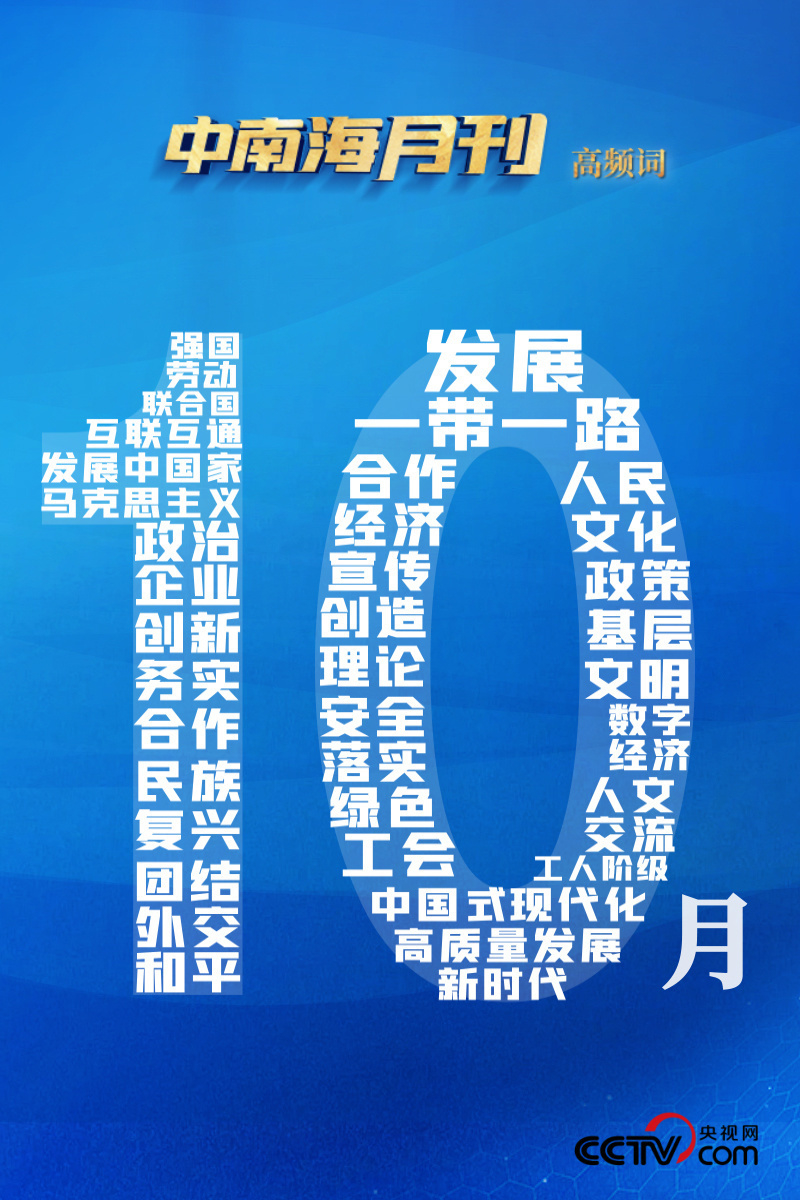 高頻詞蘊(yùn)含著習(xí)近平總書記治國理政的深邃思想與生動實(shí)踐。央視網(wǎng)I學(xué)習(xí)數(shù)據(jù)庫梳理分析習(xí)近平總書記10月重要講話顯示,“發(fā)展”“合作”“人民”等詞持續(xù)高頻出現(xiàn),“一帶一路”“文化”等詞特別引人關(guān)注。