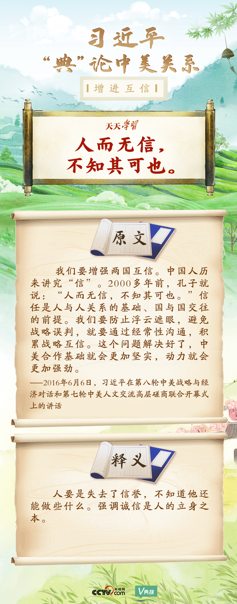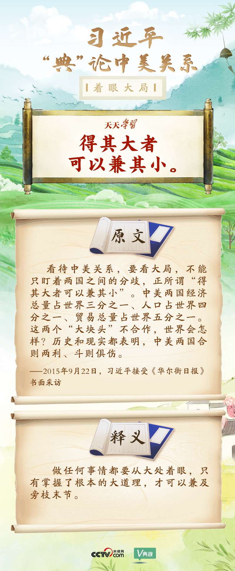 黨的十八大以來,習(xí)近平主席就中美關(guān)系發(fā)表了一系列重要講話。他站在時(shí)代高度分析、研判中美關(guān)系現(xiàn)狀及發(fā)展趨勢,并引經(jīng)據(jù)典為發(fā)展中美關(guān)系指出正確方向。這些論述蘊(yùn)含深刻的戰(zhàn)略思維和政治智慧,具有重大現(xiàn)實(shí)意義和深遠(yuǎn)歷史意義。央視網(wǎng)《天天學(xué)習(xí)》與您一起深刻領(lǐng)會。