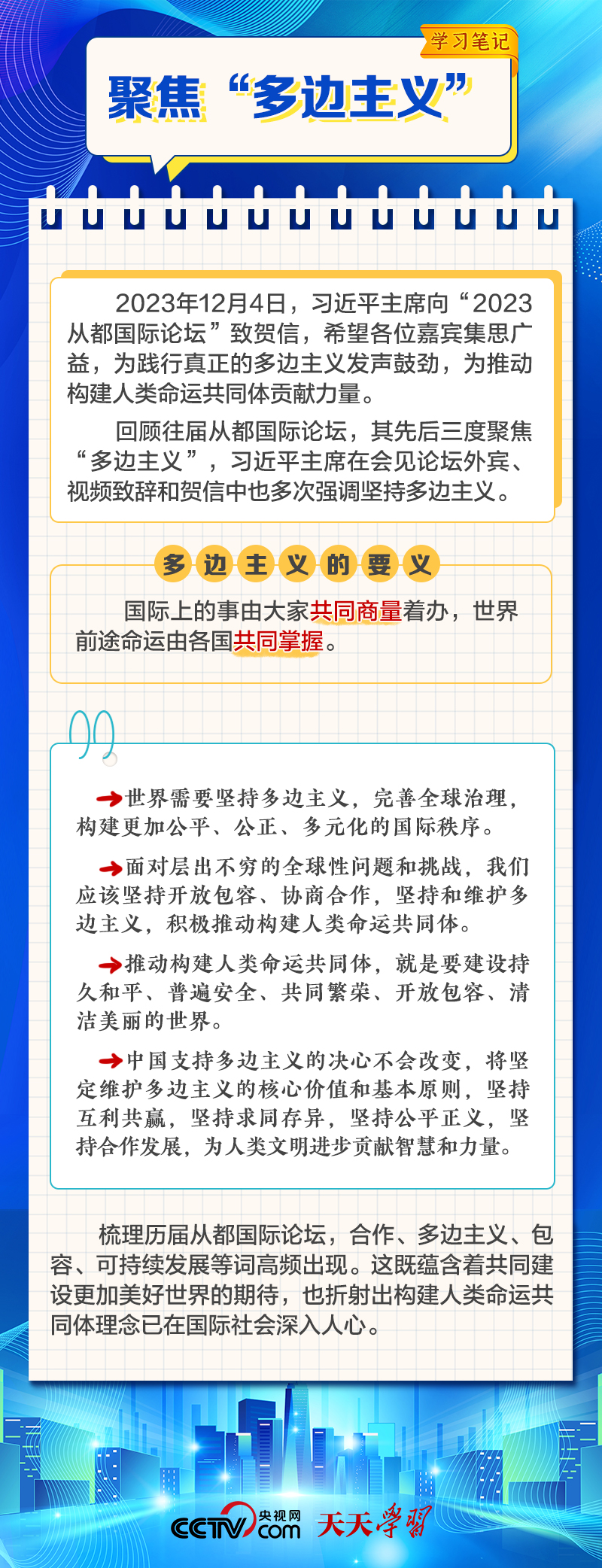 天天學習12月4日,習近平主席在致“2023從都國際論壇”的賀信中強調(diào),面對前所未有的世界之變、時代之變和歷史之變,人類社會必須團結(jié)起來,堅持互學互鑒、開放包容、合作共贏,弘揚全人類共同價值,共同建設更加美好的世界。