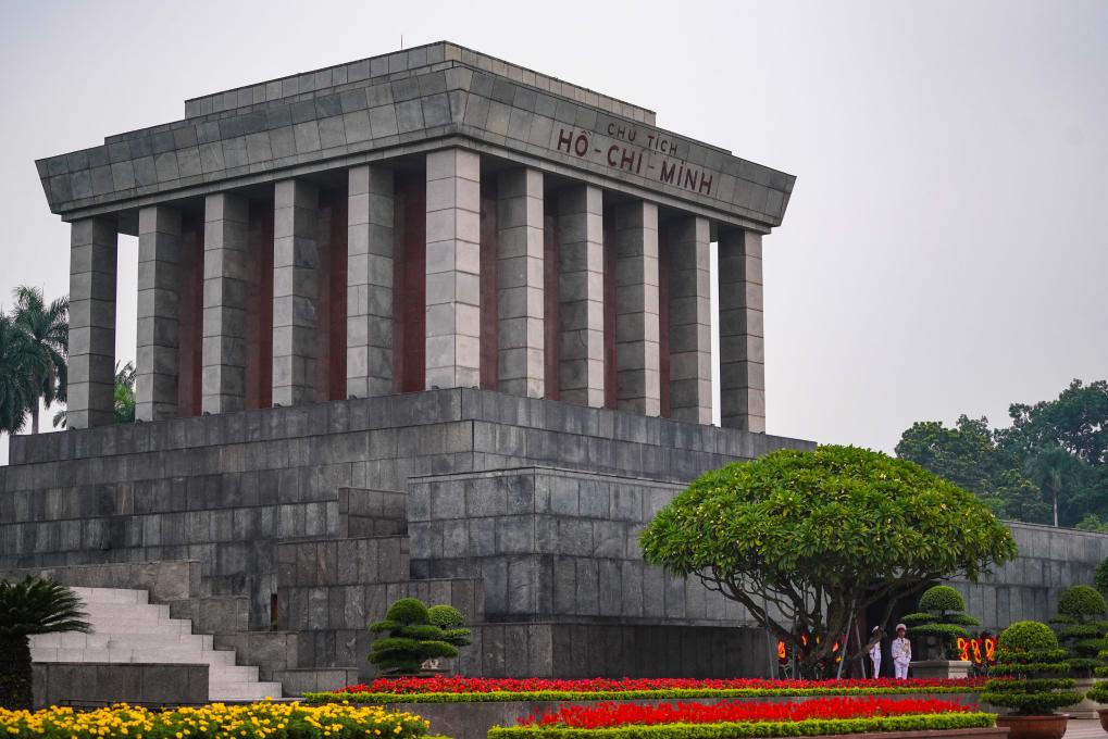 12月9日,越南主席府外大屏幕上展示中越兩國(guó)國(guó)旗。