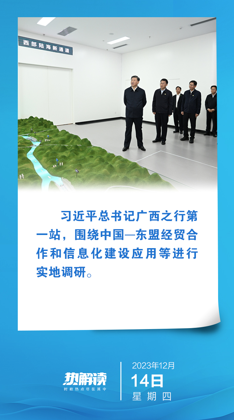 熱解讀12月14日,結(jié)束越南出訪回國后,習(xí)近平總書記在廣西考察。第一站,他走進(jìn)中國—東盟信息港股份有限公司,圍繞中國—東盟經(jīng)貿(mào)合作和信息化建設(shè)應(yīng)用等進(jìn)行實地調(diào)研。