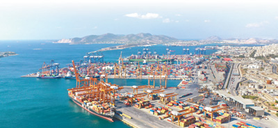 希臘比雷埃夫斯港集裝箱碼頭遠景。