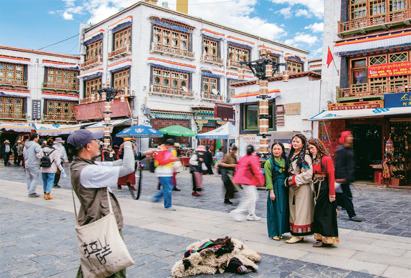 千年八廓街,見(jiàn)證民族團(tuán)結(jié)。2021年7月,習(xí)近平總書(shū)記來(lái)到位于西藏拉薩老城區(qū)的八廓街,感慨地說(shuō):“千年八廓街,是我們各民族建起來(lái)的八廓街。各民族文化在這里交流交往交融,我們中華民族的大家庭在這里其樂(lè)融融。”圖為2023年6月13日,游客身著藏裝在八廓街拍照留念。 新華社記者 姜帆/攝