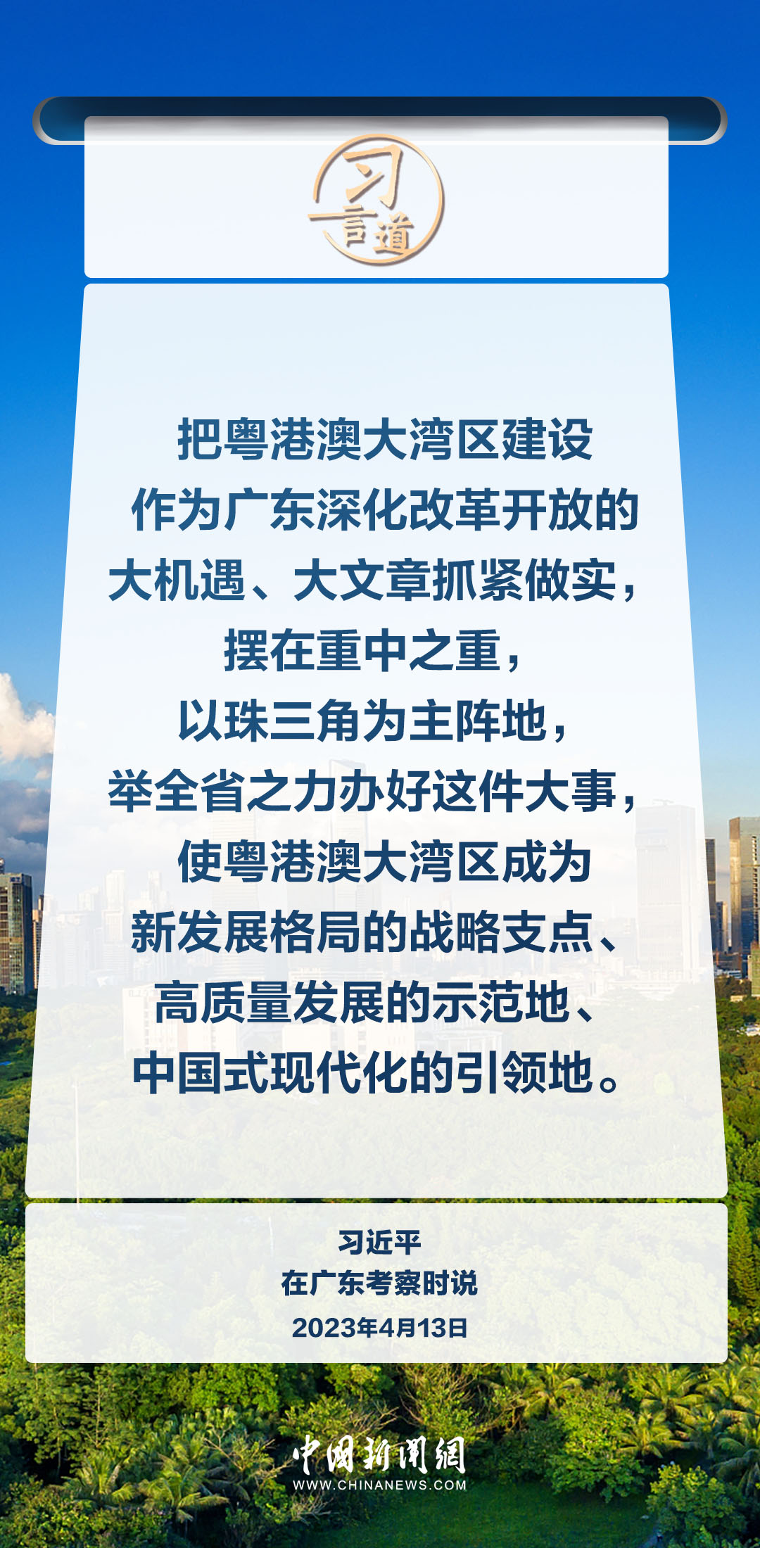 建設(shè)粵港澳大灣區(qū),是習(xí)近平總書記親自謀劃、親自部署、親自推動的重大國家戰(zhàn)略。習(xí)近平在多個重大會議、重要場合對粵港澳大灣區(qū)建設(shè)作出重要指示、提出明確要求。