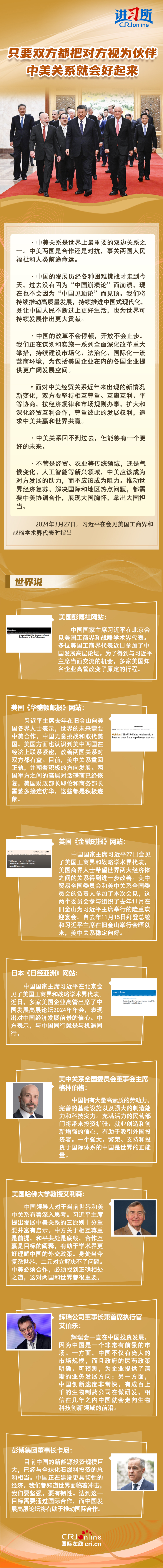 3月27日,中國國家主席習(xí)近平在北京會見美國工商界和戰(zhàn)略學(xué)術(shù)界代表時指出,中美各自的成功是彼此的機(jī)遇。只要雙方都把對方視為伙伴,相互尊重、和平共處、合作共贏,中美關(guān)系就會好起來。
