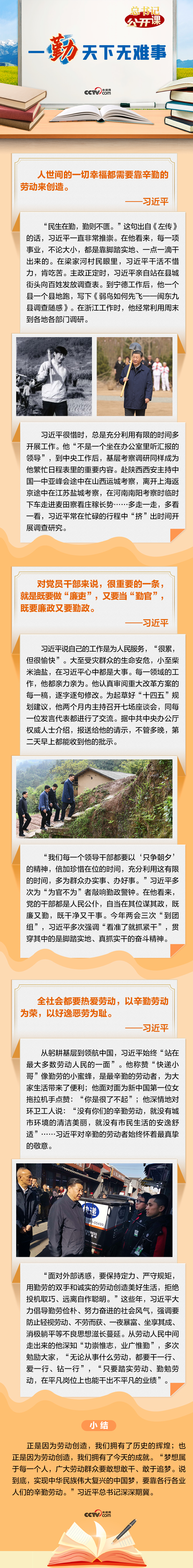習(xí)近平總書(shū)記強(qiáng)調(diào),“一勤天下無(wú)難事”,“實(shí)現(xiàn)中華民族偉大復(fù)興的中國(guó)夢(mèng),要靠各行各業(yè)人們的辛勤勞動(dòng)”。“勤”是貫穿總書(shū)記從政生涯的品質(zhì),是對(duì)他夙夜在公、勤勉工作最為凝練的概括。