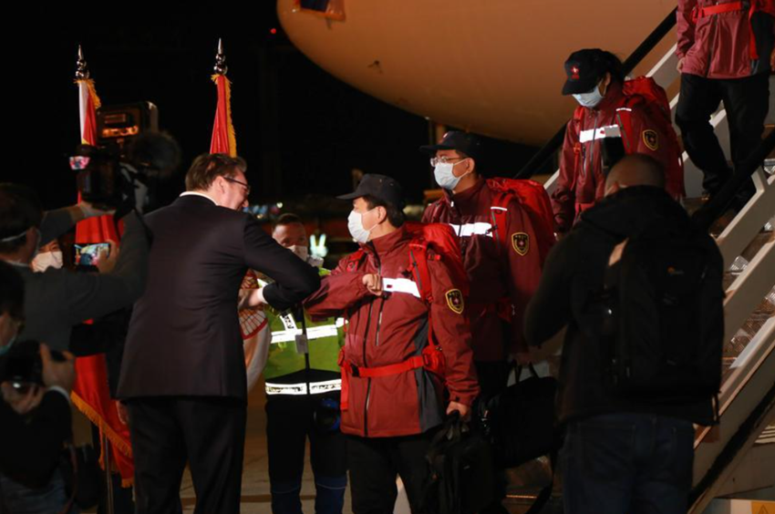 中國醫(yī)療團(tuán)隊(duì)在貝爾格萊德尼古拉·特斯拉機(jī)場降落時(shí)已是深夜。武契奇率領(lǐng)塞方多名高級官員到機(jī)場迎接。疫情期間不建議握手,于是這位塞爾維亞領(lǐng)導(dǎo)人選擇和中國專家團(tuán)成員一一碰肘以示尊重。對中國的及時(shí)支援心懷感激,他還在機(jī)場親吻了一面五星紅旗。