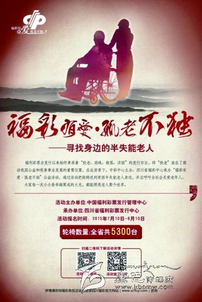 為踐行福利彩票“扶老、助殘、救孤、濟(jì)困”宗旨,州福彩中心將在全州范圍內(nèi)開展“福彩有愛·孤老不獨(dú)”大型慈善公益活動(dòng),特向我州貧困半失能老人免費(fèi)贈(zèng)送福彩愛心輪椅。