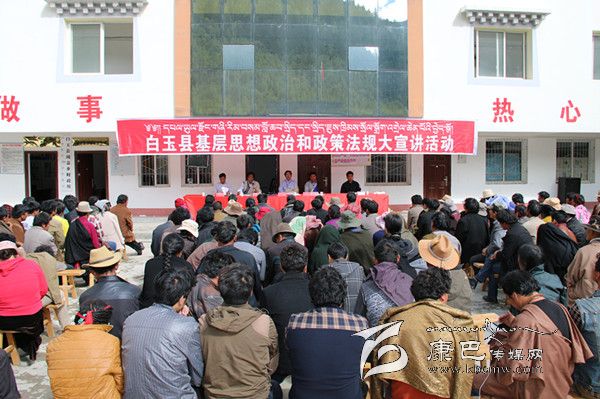 8月的白玉,烈日當頭,秋高氣爽。31日上午,絨蓋鄉(xiāng)政府大院內(nèi),白玉縣基層思想政治和政策法規(guī)大宣講活動正在這里精彩“上演”,400多名前來“聽課”的各村群眾正津津有味地品味著縣宣講團成員松吉尼瑪通俗易懂的藏語大宣講。從黨的十八大到十八屆三中全會精神,從糧食直補到低保、新農(nóng)保,從養(yǎng)老保險、殘疾人幫扶到相關法律法規(guī),宣講者深入淺出,傾聽者全神貫注。