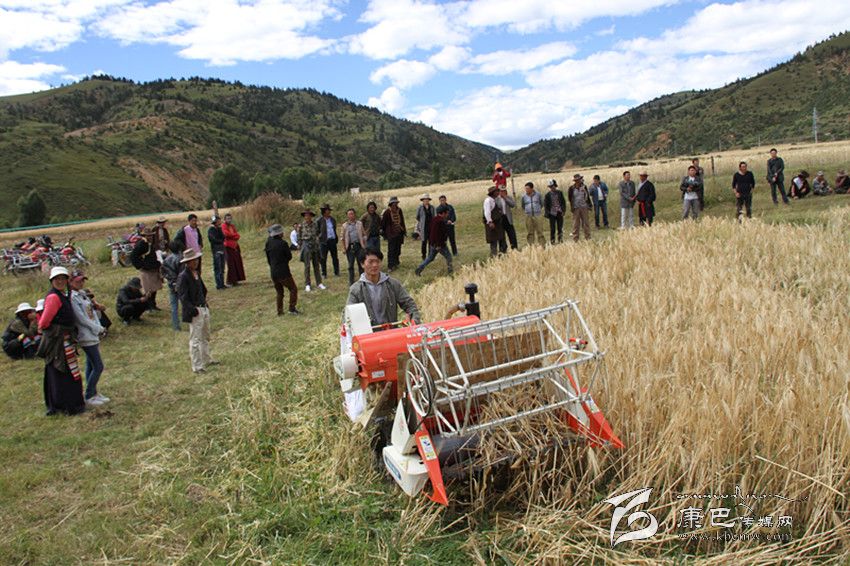 9月14日,在海拔3600多米的理塘縣甲洼鄉(xiāng)下依村成熟青稞地里,縣農(nóng)牧和科技局的農(nóng)機手正用小型聯(lián)合收割機示范收割青稞。7個行政村的村支書、村主任在現(xiàn)場觀摩學(xué)習。俄曲村支書洛真說:“這個小型聯(lián)合收割機很適合我們高原,這將大大減輕我們的勞動強度,不用再擔心下雨影響搶收。” (葉強平 攝影報道)