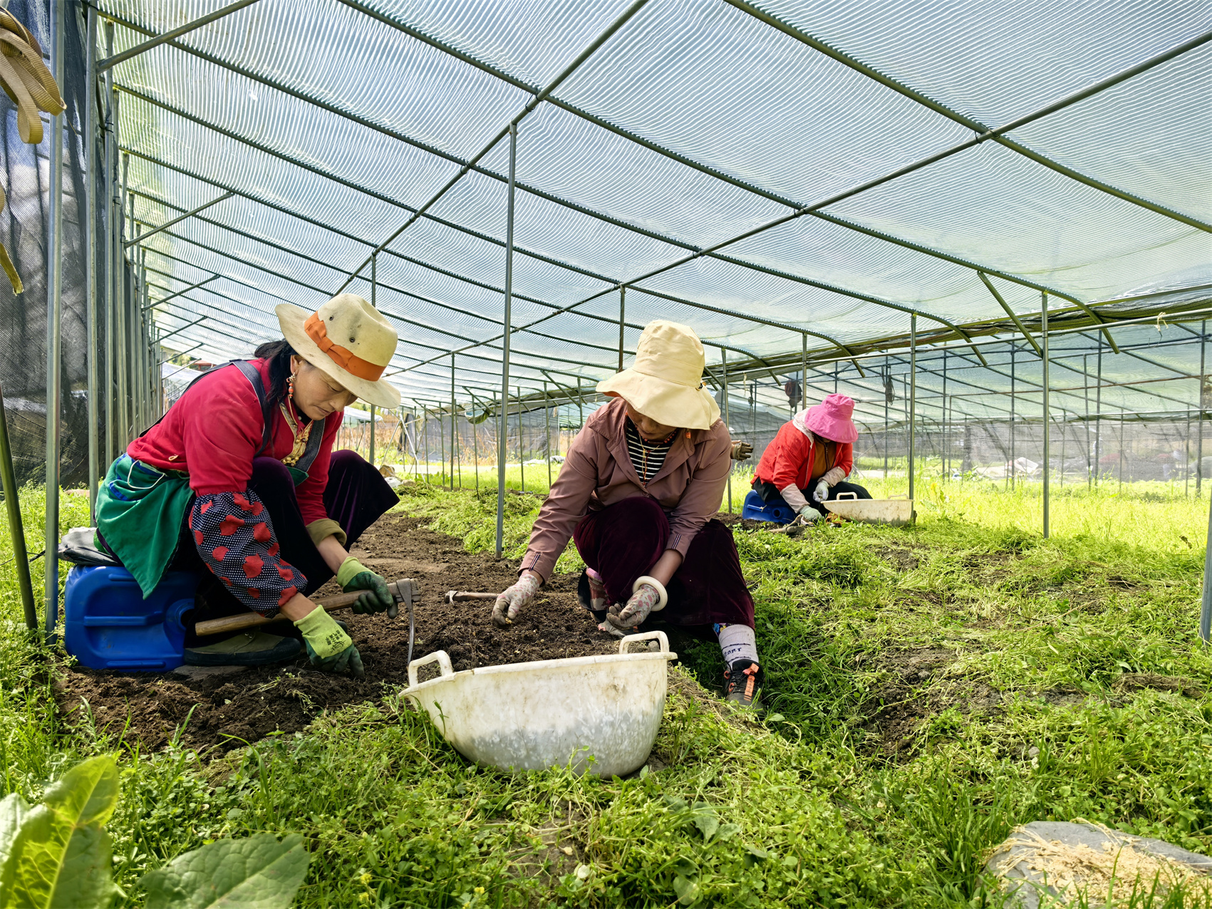 村民在基地中藥材大棚除草。