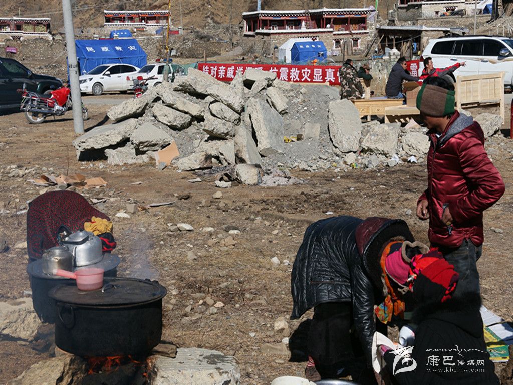 走進(jìn)八美鎮(zhèn)重災(zāi)區(qū)中古村災(zāi)民安置區(qū),第一眼就能看見戴著紅袖章的兩個村民正圍著兩個大灶轉(zhuǎn)來轉(zhuǎn)去忙個不停。村民巴青老人說:“災(zāi)后,我們隊(duì)的村民都集中安置在這里,為方便受災(zāi)群眾和前來幫忙的干部都能喝上一口熱茶,我們幾個村民臨時搭建了兩個‘三鍋莊’灶臺,用來燒清茶和開水,因?yàn)槲覀冎烙行└刹苛?xí)慣喝白開水,就特意準(zhǔn)備了一個燒白開水的鍋。”他指著正在搶修房屋的黨員服務(wù)隊(duì)說:“地震發(fā)生到現(xiàn)在,很多領(lǐng)導(dǎo)來看望我們,很多干部到村上幫助搶修房屋、運(yùn)送物資,這么冷的天,他們一直不停地在幫我們做事情,很辛苦!我們不能光等著干部們來給我們做事情,我今年68歲,雖然做不了大的事,但是給他們燒茶遞水是沒有問題的。”