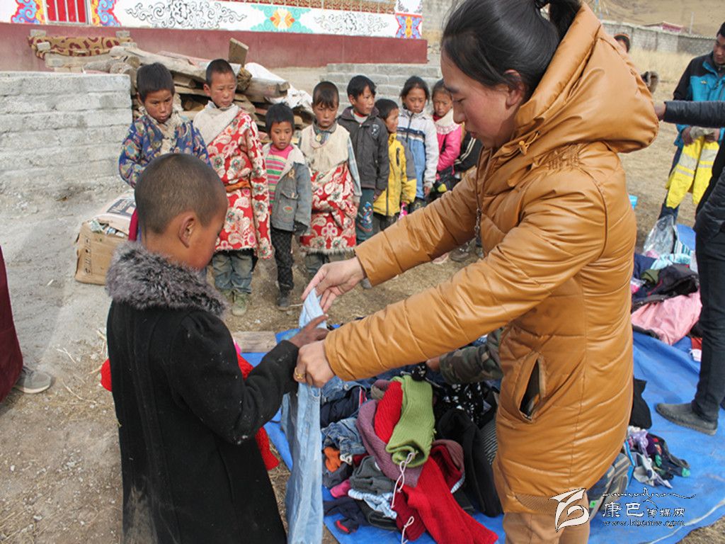 明措為貧困兒童發(fā)放衣物。