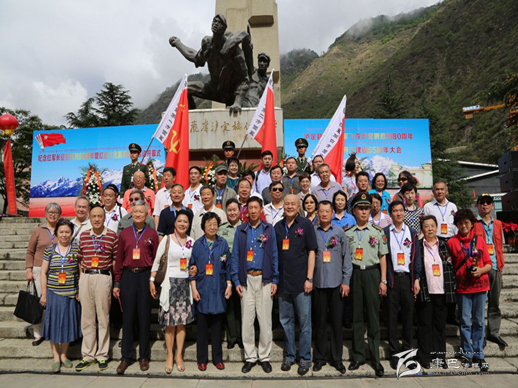 紅軍后代和原第十八軍官兵代表,飛奪瀘定橋二十二勇士親屬代表在紀念碑前合影。