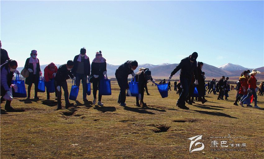 5月11日,距石渠縣城約5公里處的草原上人聲鼎沸,格外熱鬧。一大早,來自各單位的300余名黨員干部便聚集到了這里,身穿紅背心的青年志愿者們正忙著為大家分發(fā)口罩、手套等勞動物品。而在人群最前端,一輛拖拉機滿載著一車類似飼料的東西,七八個人正有條不紊地將“飼料”卸車并分裝進數(shù)百個藍色環(huán)保袋中。