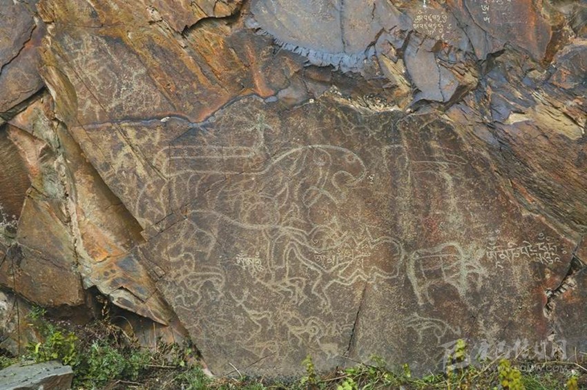 省考古院李飛介紹,其中一處巖畫上,還能看到古藏文的題記。這些圖像均為密點(diǎn)鑿刻,創(chuàng)作者先用細(xì)線在崖壁上刻劃出輪廓,再通過(guò)密點(diǎn)敲鑿出圖像。它們中,有的是通體剪影式,有的則是粗線條輪廓式。