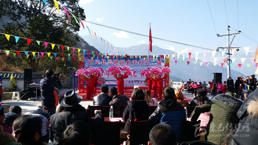 鼓聲喧天、歌聲飛揚(yáng),現(xiàn)場(chǎng)到處洋溢著濃濃的節(jié)日氛圍。浩浩蕩蕩的隊(duì)伍也引來(lái)了不少村民和游客們的關(guān)注。特別是隊(duì)伍中幾個(gè)唱山歌的村民獨(dú)特的腔調(diào)和唱詞盡展和平村山歌的特色。和平村每到冬月以后,村民家家戶戶便開(kāi)始?xì)⒛曦i,相互串門(mén),吃年豬宴,這一習(xí)俗已傳承百年,在和平村村民的心中,年豬文化節(jié)是一個(gè)慶祝豐收的節(jié)日。上午十點(diǎn)半,游行隊(duì)伍來(lái)到了和平村村級(jí)活動(dòng)室,“豬王”被放在了舞臺(tái)中間,焚香祈福后,當(dāng)?shù)卮迕裼幂d歌載舞的方式共慶這一節(jié)日的成功舉辦。村民們自編自演的舞蹈《祖國(guó)您好》《喜慶臨門(mén)》《紅梅贊》,現(xiàn)場(chǎng)表演唱山歌打草鞋,每一支舞,每一首歌都傳遞著村民們對(duì)黨對(duì)祖國(guó)對(duì)新生活的無(wú)限熱愛(ài)。