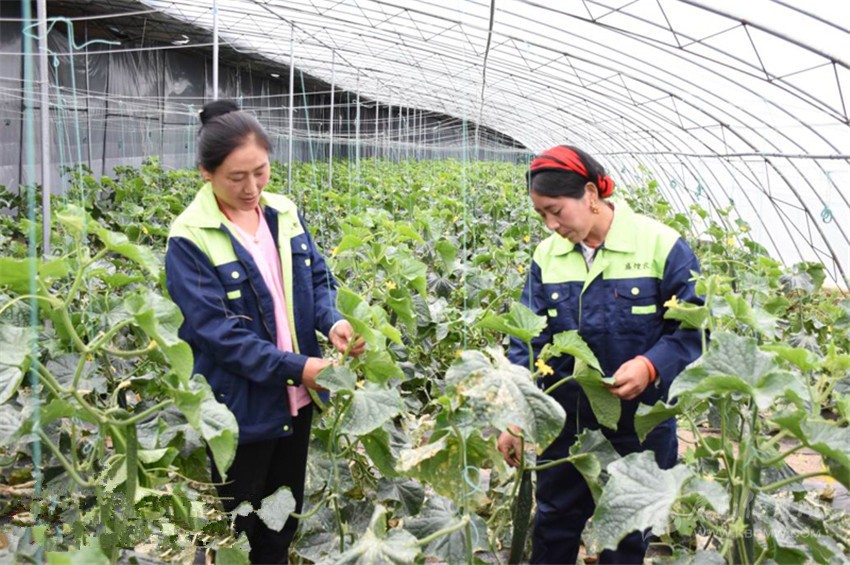 格絨青措(右)和阿佳(左)正在蔬菜大棚里管護(hù)黃瓜苗。