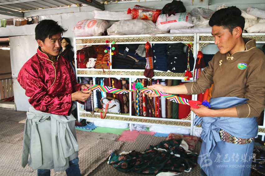 安孜鄉(xiāng)作為白玉縣海拔較高的鄉(xiāng)鎮(zhèn)之一,夏天是十分短暫的,連日來的晴好天氣,也透著絲絲寒氣。牧民阿剛想要量身定做一套過冬的藏裝,8月26日,他來到白玉縣阿察鎮(zhèn),一家民族服飾商貿(mào)公司吸引了他的目光?!拔覀冞@里的服裝面料是本地羊毛和從浙江進(jìn)的上等面料,做工考究,很多工序是純手工制作,服裝樣式你可以根據(jù)你的喜好指定,我們包你滿意?!钡陠T仁真熱情地介紹。聽了仁真的介紹,阿剛用手捻了一下服裝用料的質(zhì)地,看到印有“祥陽措”商標(biāo)的精美包裝袋,商店里擺放的五彩斑斕、高端大氣的藏式男女服裝,他有些動心了?!吧a(chǎn)這些服裝的都是我們納塔鄉(xiāng)的牧民,你可以考察我們的服裝用料、生產(chǎn)流程,再作打算?!比收鏌崆檠笠绲亟榻B說。