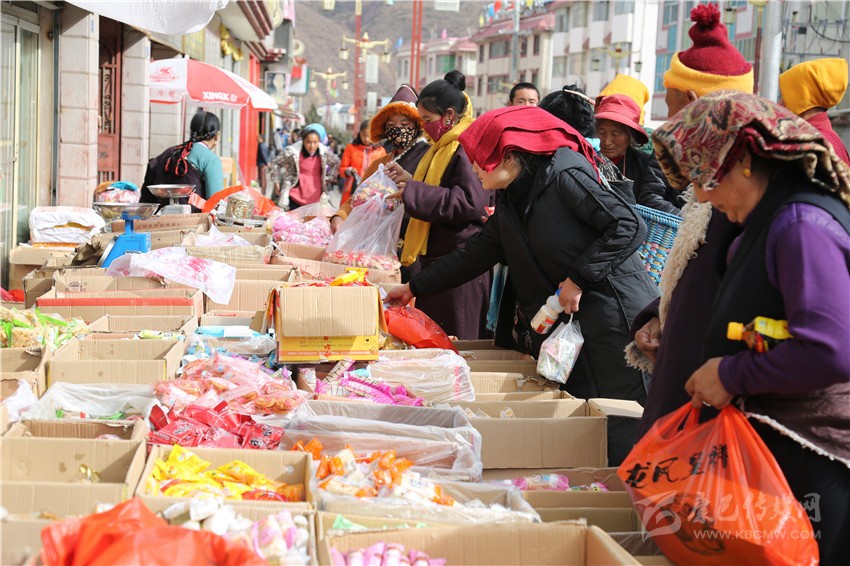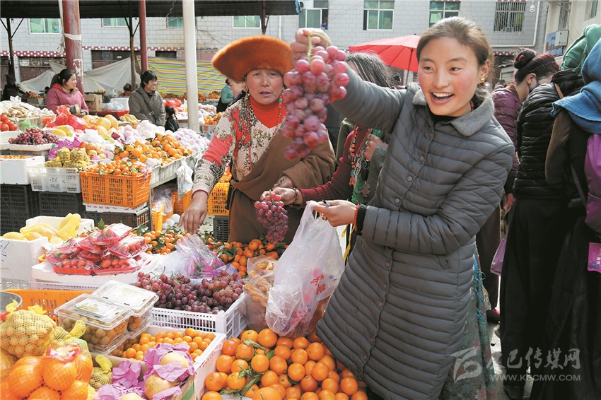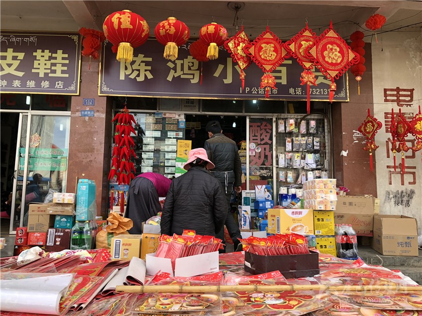 新都鎮(zhèn)格色村的丹真大哥和老伴兒其吉牽著8歲的孫子正在干果店里挑選各類干果,身后的背簍里水果、蔬菜、酥油、牛肉等農(nóng)畜產(chǎn)品以及中國(guó)結(jié)、年畫(huà)、對(duì)聯(lián)、掛圖等吉祥的節(jié)日物品應(yīng)有盡有。