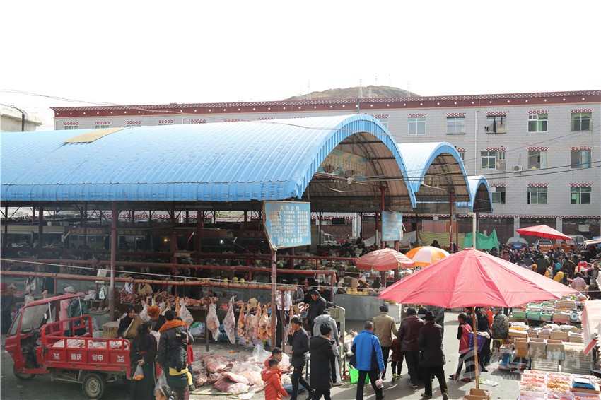 走進(jìn)康北農(nóng)貿(mào)市場(chǎng),筆者看到,一捆捆新鮮的綠色蔬菜、一塊塊剛剛宰好的牦牛肉、一箱箱水果整齊地?cái)[放在臺(tái)案上吸引著過(guò)往農(nóng)牧民群眾的眼球。不大的市場(chǎng)里熱鬧非凡,大家有人正忙著選購(gòu)牛肉、水果和糖等年貨,有人正把一箱箱包裝好的年貨往車上搬運(yùn)。