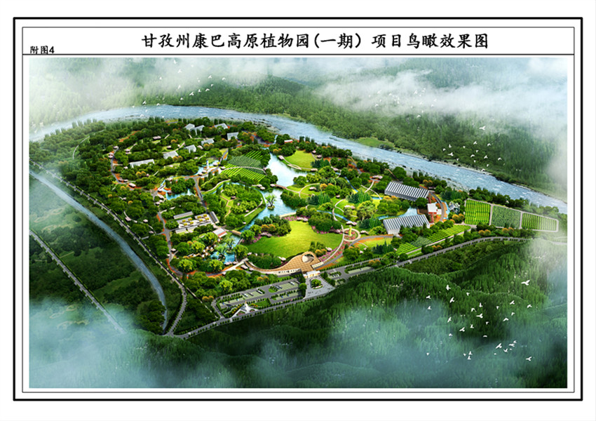 甘孜州康巴高原植物園(一期)項(xiàng)目鳥(niǎo)瞰效果圖。