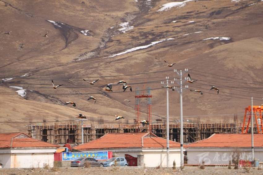 當岸邊的相機瞄準了赤麻鴨時,它們儼然變成了色達的明星,時而成群展翅,劃過冰面,飛向高空,時而交頸嬉戲,溫馨和睦,在藍天、白云和雪峰的襯托下,優(yōu)雅的舞姿盡展了色達山川的廣闊壯美。